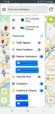 This app features a scrollable, zoomable map that displays: • Traffic speeds • Road Conditions • Weather Restrictions • Updated PennDOT snowplow locations (Track My Plow) • Incidents and closures, such as collisions and other road hazards • Cameras • Roadwork • Message Signs • PennDOT Bridges • PA Turnpike Information • And many other info layers!