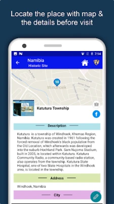 Apart from this, Namibia Travel & Explore guides you Why, When and How to visit various places in Namibia with precise location on the detailed Map. There are three ways to explore this app - Category view, City view and EduBank favorite places view. Pin your destinations and get the routes on the Map. Not only this, you can see exactly how the places look like with Street View integrated in this app. The app also has a feature to Rate and write Review/Experience regarding entity(s) through Login. Your Travel experience and rating will help the user community.